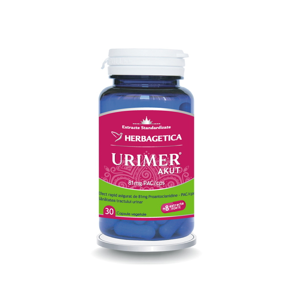 Urimer Akut combina extracte standardizate de Merisor, Aronia, Strugurii-ursului, Splinuta, Urzica si Coada-calului, alaturi de Vitamina C naturala si Vitamina D3, pentru un efect complex impotriva infectiilor urinare. Extractele bogate in PAC (proantocianidine) din Merisor si Aronia inhiba aderarea bacteriilor pe peretii tractului urinar, facilitand eliminarea acestora.