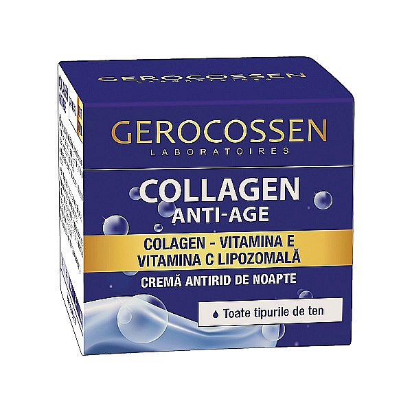 Crema antirid de noapte Collagen Anti-Age de la Gerocossen este esentiala pentru ingrijirea completa a pielii mature. Formula sa bogata, pe baza de colagen, vitamina E si vitamina C lipozomala, sustine procesele naturale de regenerare celulara care au loc in timpul somnului. Colagenul hidrateaza intens si netezeste ridurile, imbunatatind elasticitatea pielii, in timp ce vitaminele E si C lipozomala protejeaza impotriva radicalilor liberi si stimuleaza sinteza naturala de colagen. Dimineata, pielea este vizibil mai ferma, mai neteda si cu un aspect mai odihnit.