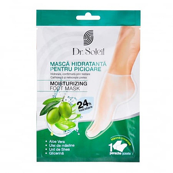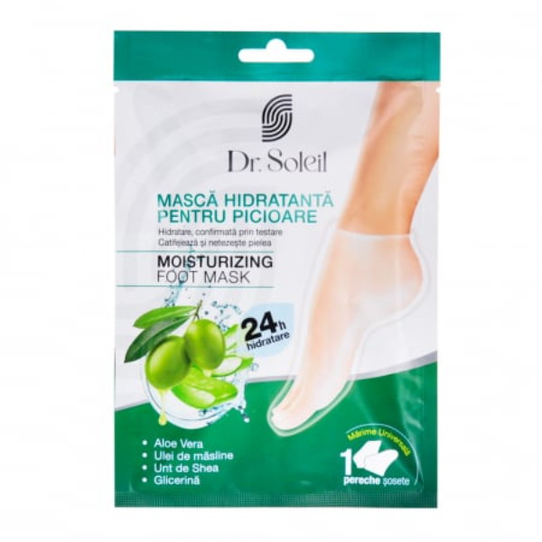 Masca hidratanta pentru picioare Dr. Soleil ofera o ingrijire intensiva pentru pielea uscata si crapata, printr-o formula bazata pe ingrediente naturale precum aloe vera, ulei de masline, unt de shea si glicerina. Sosetele imbibate in crema creeaza o experienta de relaxare similara unui tratament spa, lasand pielea fina, catifelata si protejata pe termen lung.