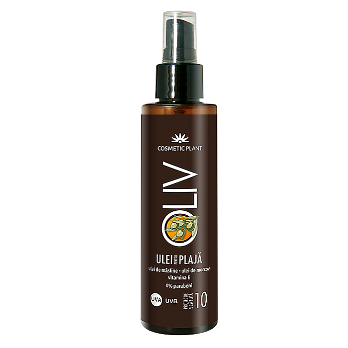 Uleiul pentru plaja OLIV cu ulei de morcov, ulei de masline si vitamina E - SPF 10 de la Cosmetic Plant contine substante filtrante UVA/UVB care protejeaza tegumentul impotriva arsurilor solare si a ridarii premature. Uleiul de morcov accelereaza bronzarea, ajutand la obtinerea unui bronz uniform. Uleiul de masline si vitamina E ingrijesc si catifeleaza epiderma, lasand pielea hidratata si supla in timpul expunerii la soare. Formula este rezistenta la apa.