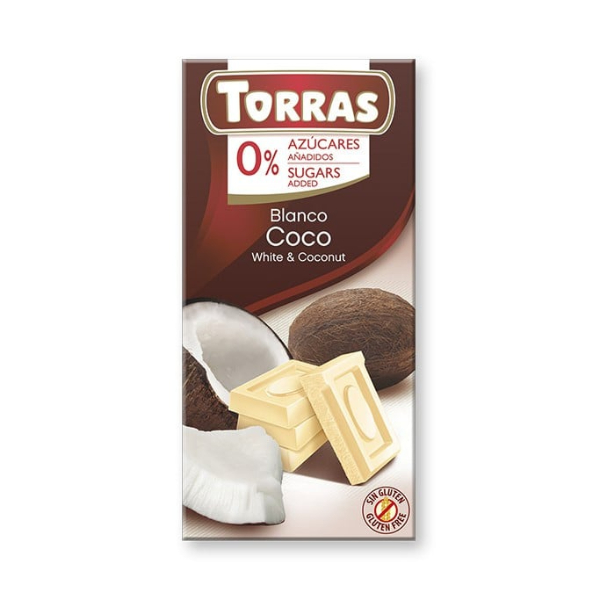 Ciocolata alba cu cocos (fara zahar, fara gluten), 75 g - Torras