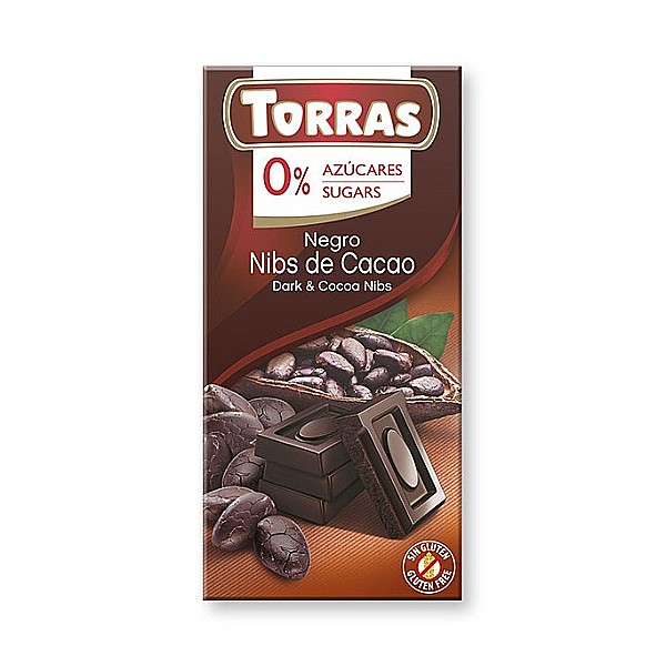 Ciocolata neagra cu bucatele de cacao (fara zahar, fara gluten), 75 g - Torras