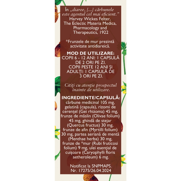 Carbune medicinal 105 mg, ghinda de stejar 45 mg, rizomi de cerentel 45 mg, frunze de afin, menta, coada soricelului.