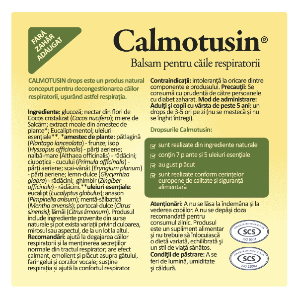Calmotusin fara zahar este un supliment alimentar destinat sustinerii sanatatii cailor respiratorii. Contine extracte naturale din plante cu efect emolient, expectorant si decongestionant, ajutand la calmarea iritatiilor gatului si la mentinerea unui confort respirator optim.