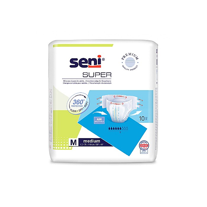 Scutecele Seni Super sunt concepute pentru a oferi o solutie eficienta si confortabila pentru incontinenta urinara si fecala. Acestea se ajusteaza bine pe corp, asigurand discretie si protectie impotriva scurgerilor laterale. Datorita stratului special EDS, umezeala este absorbita si distribuita rapid, mentinand o senzatie de uscat. Suprafata AIR permite pielii sa respire, contribuind la reducerea iritatiilor. Sunt ideale atat pentru persoanele active, cat si pentru cele cu mobilitate limitata.