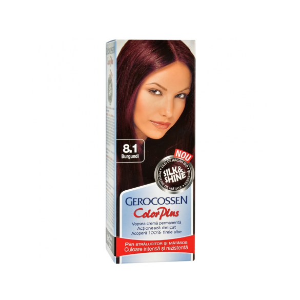 Vopseaua de par silk & shine, in nuanta 8.1 burgundi, asigura o colorare permanenta si o acoperire perfecta a firelor de par albe. Gama gerocossen color plus ofera o paleta variata de culori deosebite si ultra-rezistente, care nu usuca si nu ataca firul de par. Noua formula contine ulei de argan, keratina si proteine de matase, care protejeaza parul si asigura o culoare intensa si de durata. In urma colorarii, parul va avea un luciu sanatos, fiind usor de pieptanat si coafat.