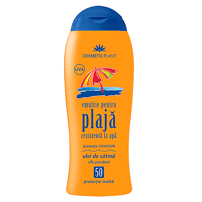 Emulsia de plaja pentru adulti SPF 50 de la Cosmetic Plant ofera o protectie foarte ridicata UVA/UVB. Efectul protector este amplificat prin prezenta uleiului de catina si a dioxidului de titan, asigurand atat o protectie UV ridicata, cat si o bronzare uniforma si de durata. Impreuna cu uleiul de masline, vitamina E protejeaza pielea impotriva imbatranirii premature. Aceasta emulsie rezistenta la apa este esentiala pentru o protectie maxima in timpul expunerii la soare.