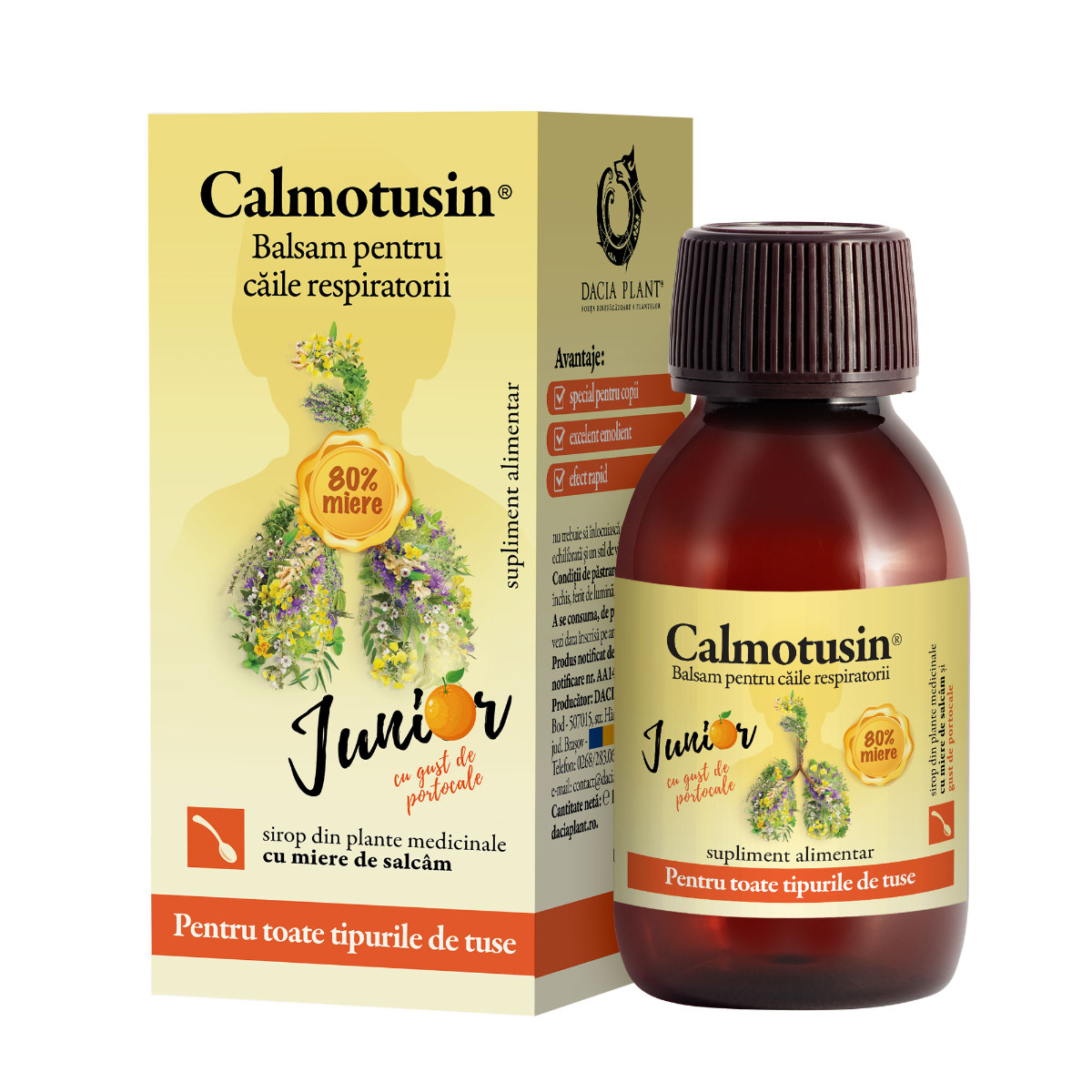 Calmotusin Junior sirop cu miere, gust portocale, 100 ml - Dacia Plant